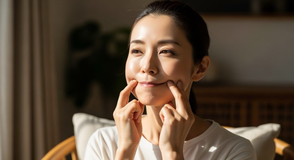 正しい姿勢で顎を引き上げ、ほうれい線を目立たなくします。