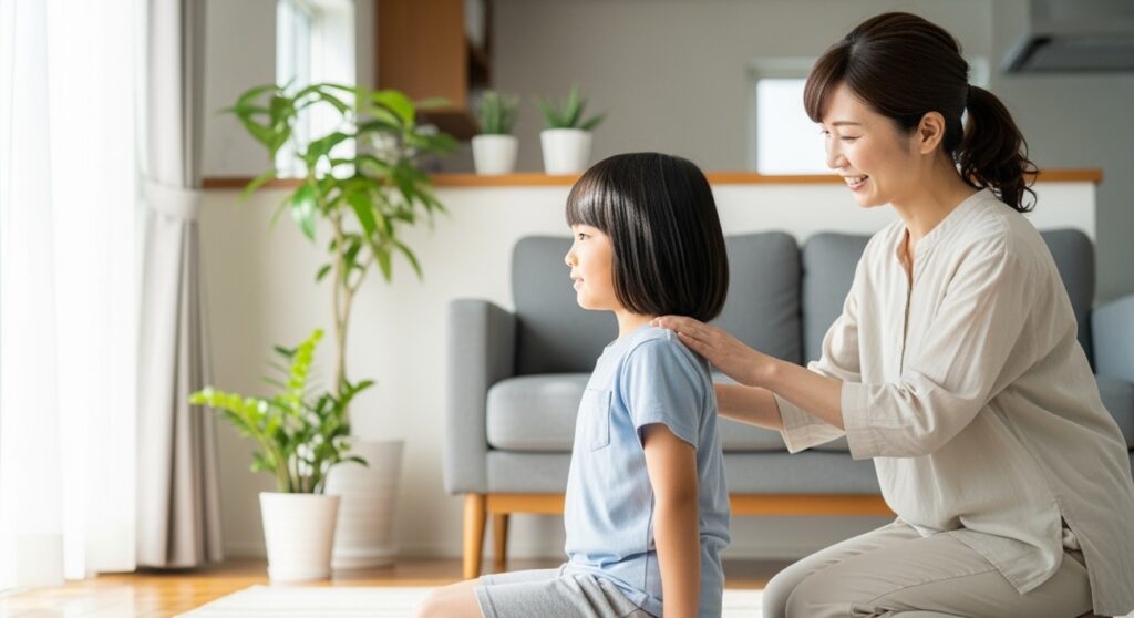 「姿勢を正しなさい」と注意するだけでは効果が薄いです。親が手本を見せたり、楽しくエクササイズを取り入れたり、環境を整えたりすることが効果的です。